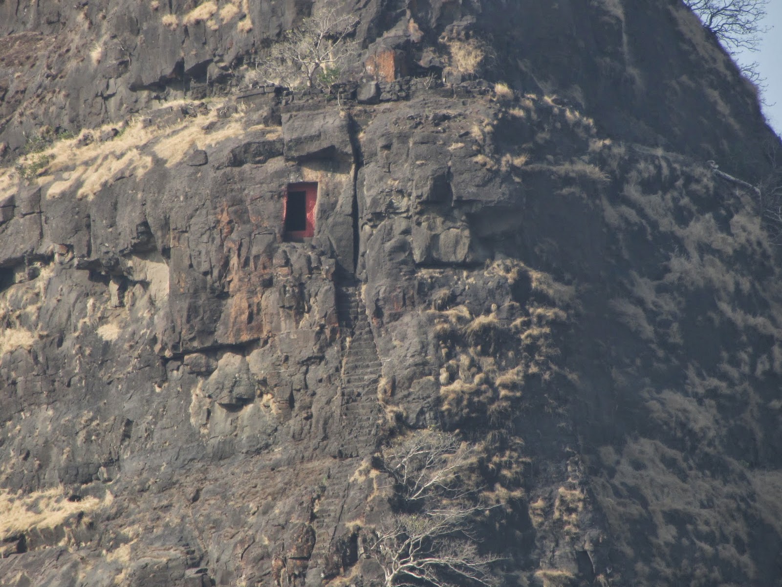 Between these staircases are the beautiful and clean caves dug out in the heart of the pinnacle. Water tanks are located next to the caves. The panorama from the caves is dominated b the Macchindragad pinnacle with views of the Deccan Plateau forming a formidable backdrop.