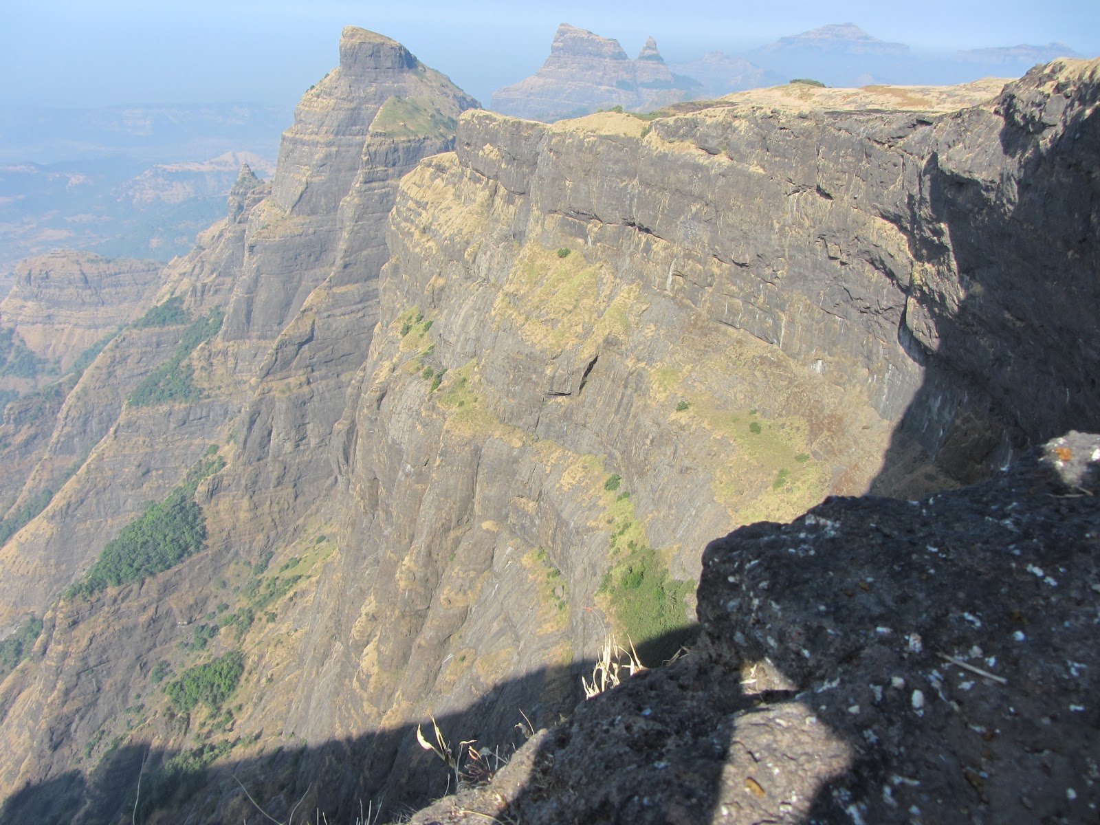 Going rightwards of Harishchandreshwar temple, we come across a huge cave. This is the cave of Kedareshwar (see picture), in which there is a big Shivlinga, which is totally surrounded by water. The total height from its base is five feet, and the water is waist-deep. It is quite difficult to reach the Shivlinga because the water is ice-cold. There are sculptures carved out here. In monsoon it is not possible to reach this cave, as a huge stream flows across the way.Konkan Kada (Konkan cliff)